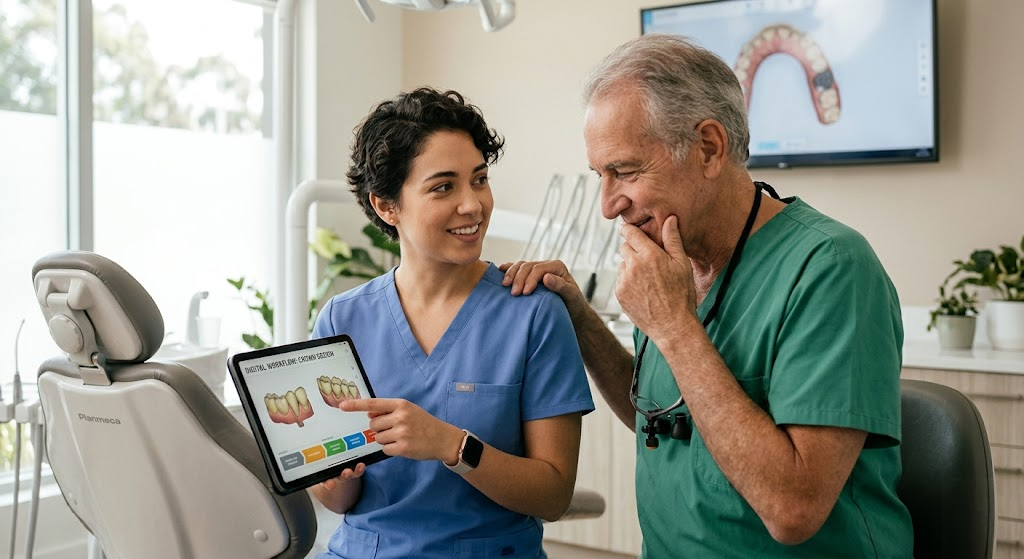 A moldagem com alginato ou silicone está para a odontologia assim como o filme fotográfico está para o streaming: funciona, mas ninguém volta depois de experimentar a alternativa. Scanners intraorais modernos capturam a arcada completa em menos de 60 segundos, com precisão submicrométrica e zero desconforto ao paciente. O resultado é um arquivo digital editável, armazenável e inviável ao laboratório em tempo real. Para o paciente, acabou o gosto ruim e o gag reflex. Para o dentista, acabou a retomada de moldagem por distorção, e junto foi embora uma fonte enorme de retrabalho silencioso.
